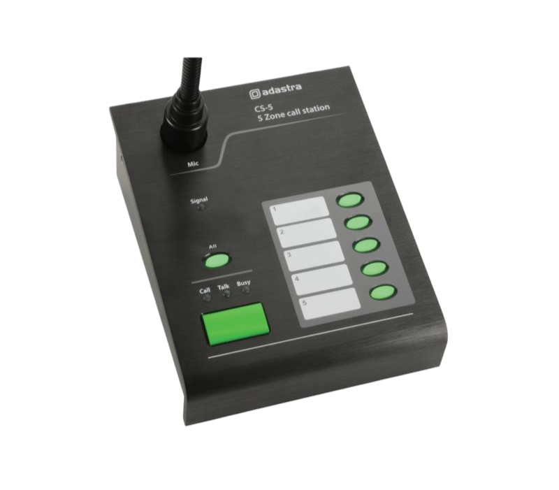 The Adastra CS–5 is a Paging Microphone with a built-in call station base. It is designed to be used with the Adastra RZ45 audio matrix. When used with the RZ45, the CS-5 forms a comprehensive paging system. Zone assign buttons allow for intuitive calling to any combination of up to 5 zones, with the page button automatically muting audio playback in those areas for clear vocal announcements.
