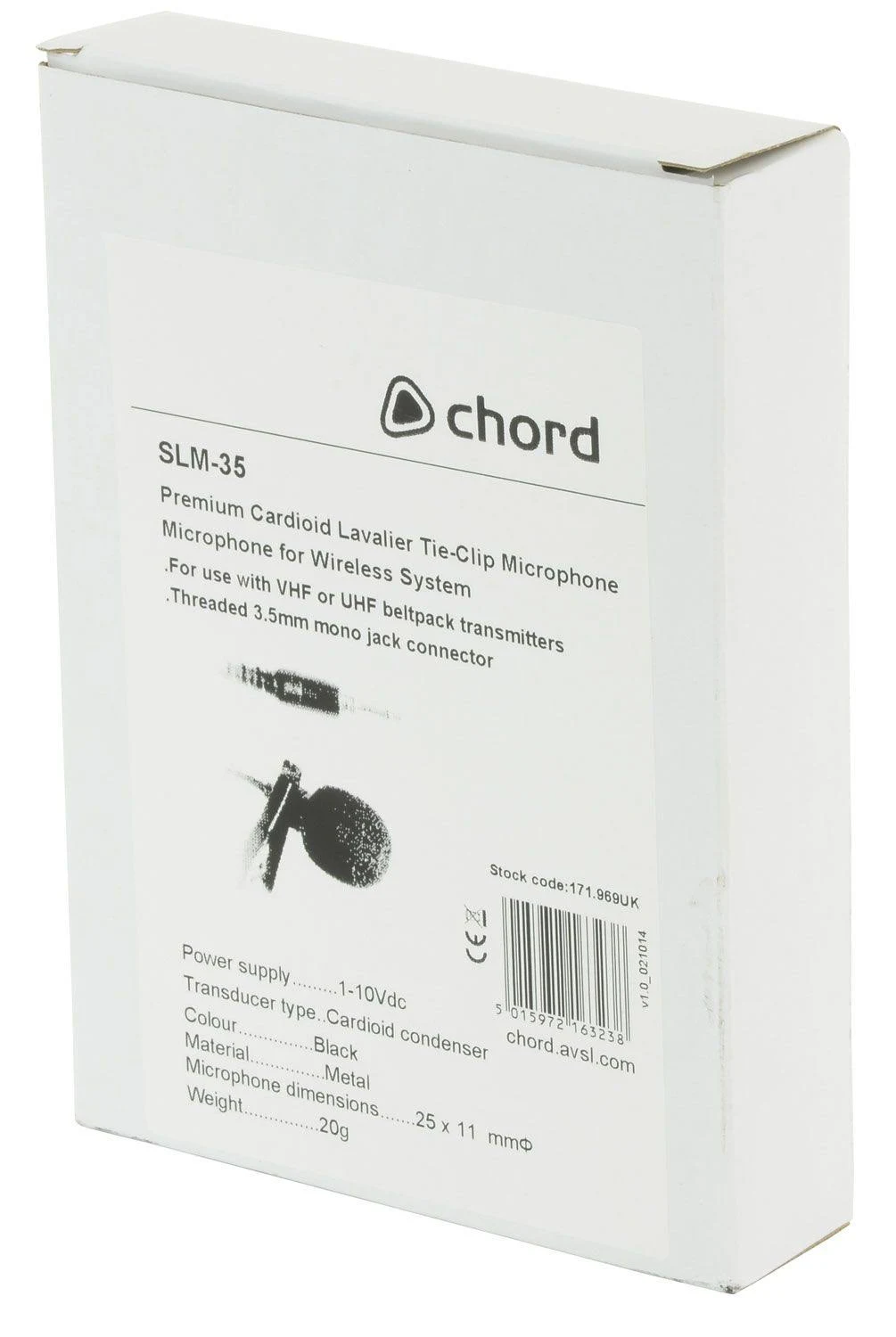 The Chord SLM–35 is the ideal choice if you need/want a reasonably-priced Replacement Lavalier Tie Clip Microphone, ompatible with Chord, Citronic or QTX VHF/UHF Wireless Beltpack Transmitters. The microphone, clip and lead are black. The pickup pattern is cardioid, and the microphone is a condenser that uses a 1-10Vdc power supply.