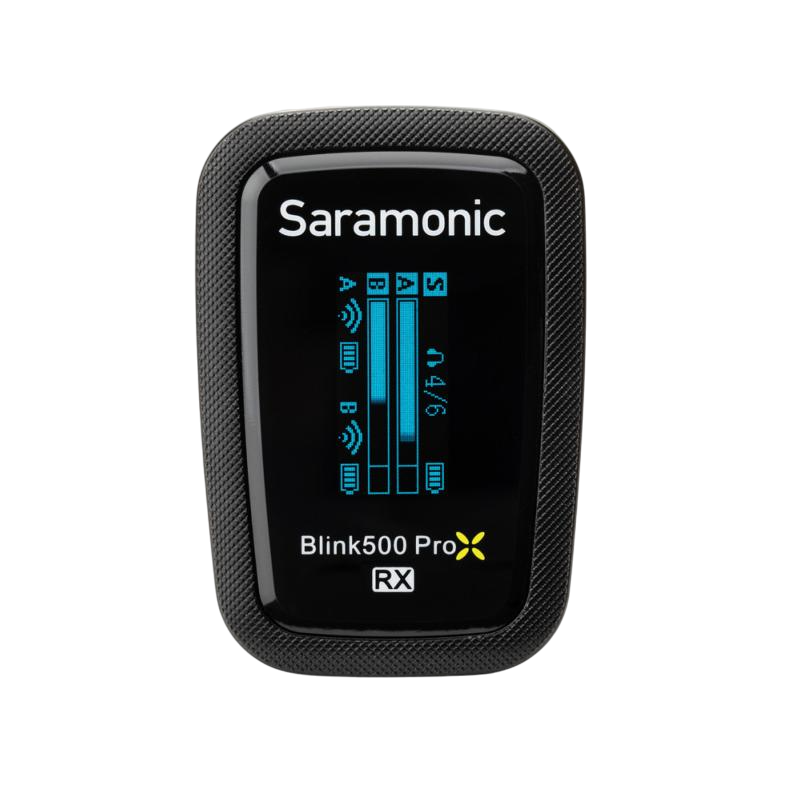 - Camera Mountable Dual receiver (RX) features a Mono/Stereo output setting, headphone out, OLED display with metering, includes a 3.5mm TRS cable, and can add a second ProX TX transmitter (sold separately).